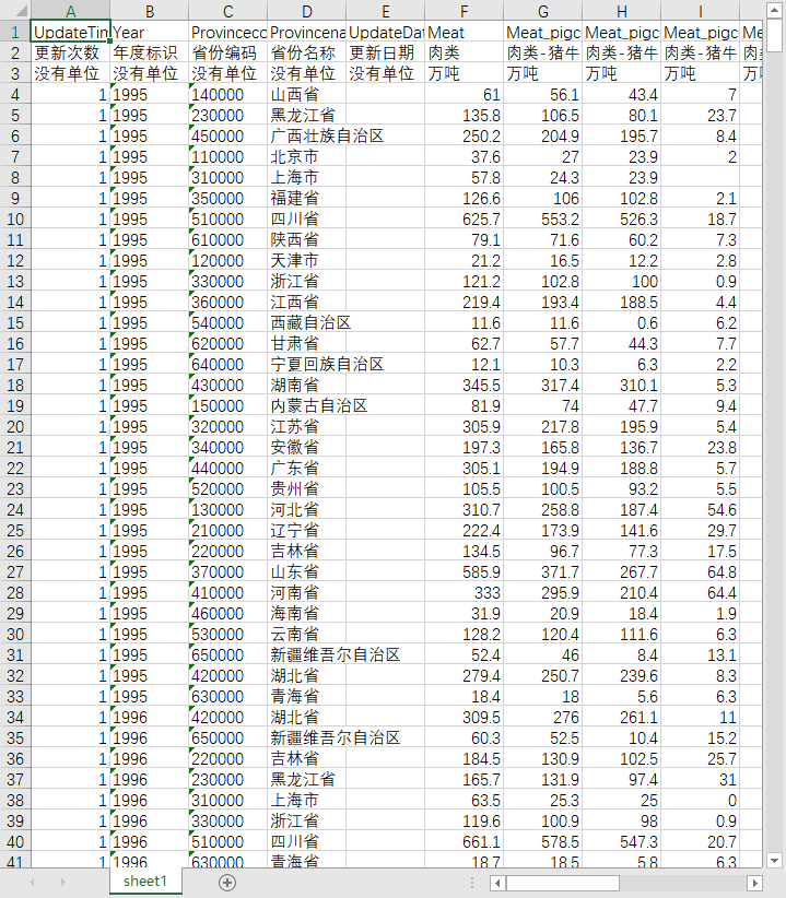 更新次数 年度标识 省份编码 省份名称 更新日期 肉类 肉类-猪牛羊肉 肉类-猪牛羊肉-猪肉 肉类-猪牛羊肉-牛肉 肉类-猪牛羊肉-羊肉 奶类 奶类-牛奶 绵羊毛 绵羊毛-细羊毛 绵羊毛-半细羊毛 山羊毛 羊绒 禽蛋 蜂蜜