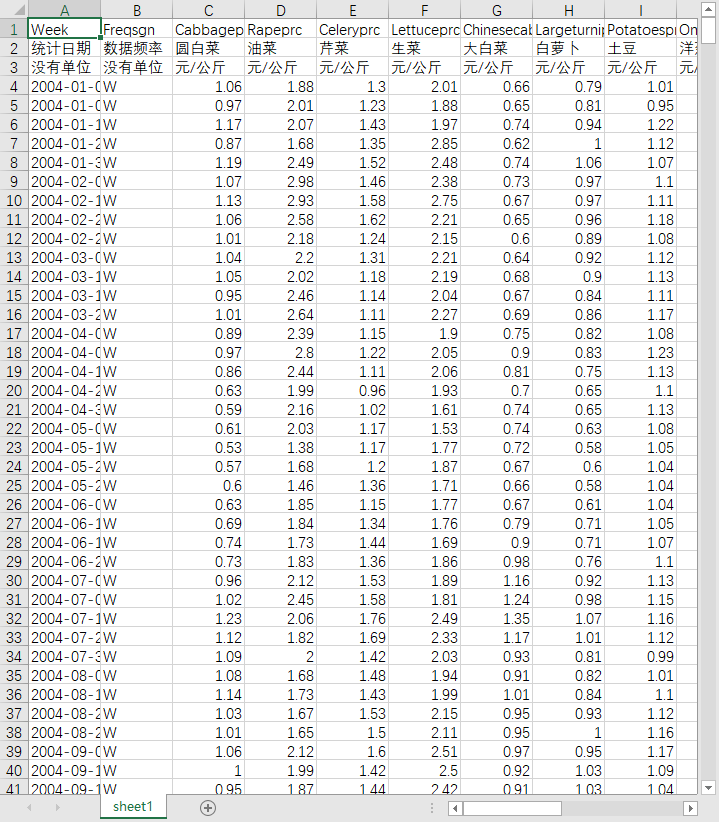统计日期 数据频率 圆白菜 油菜 芹菜 生菜 大白菜 白萝卜 土豆 洋葱 蒜头 生姜 西红柿 黄瓜 茄子 辣椒 青椒 豆角 冬瓜 苦瓜