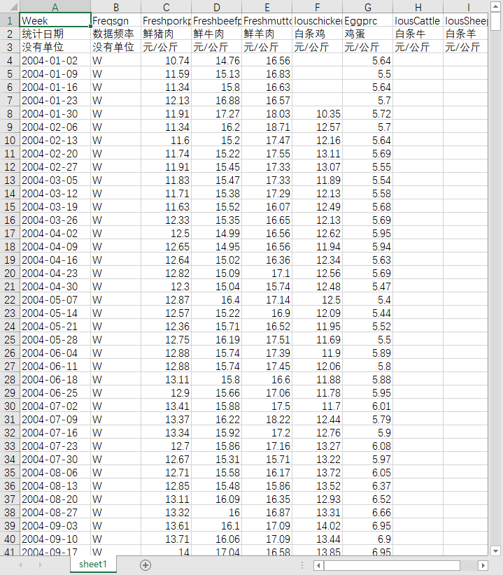 统计日期 数据频率 鲜猪肉 鲜牛肉 鲜羊肉 白条鸡 鸡蛋 白条牛 白条羊