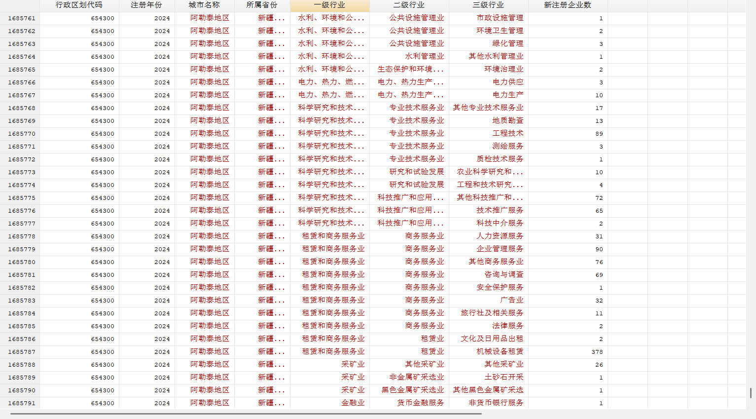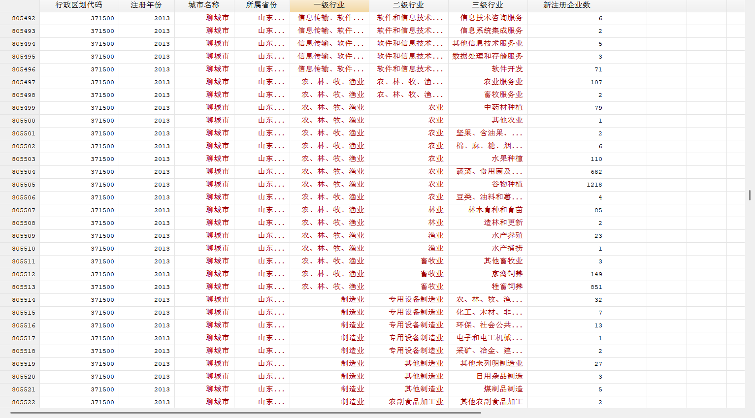 具体指标包括:行政区划代码 注册年份 城市名称 所属省份 一级行业 二级行业 三级行业 新注册企业数