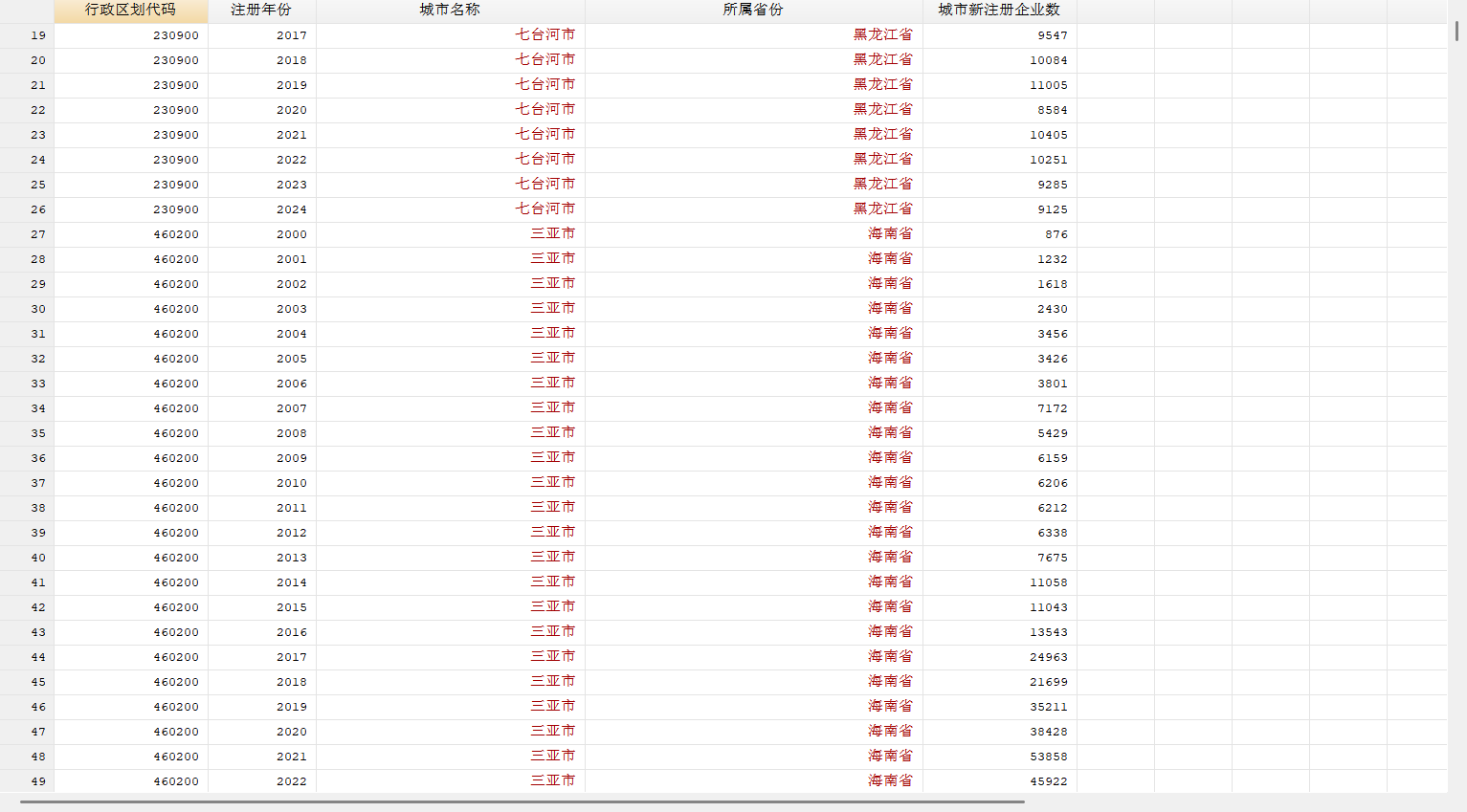 具体指标包括:行政区划代码 注册年份 城市名称 所属省份 城市新注册企业数