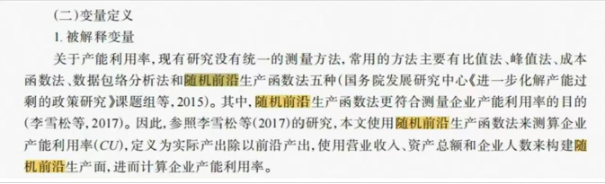 使用随机前沿生产函数法来测算企业产能利用率CU,定义为实际产出除以前沿产出,使用营业收入、资产总额和企业人数来构建随机前沿生产面,进而计算企业产能利用率。