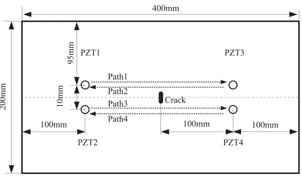 传感器配置方面,共布置四个PZT传感器于裂纹两侧,形成四条Lamb波传播路径。通过对称布局方式有效降低测量偏差,提高数据可靠性。