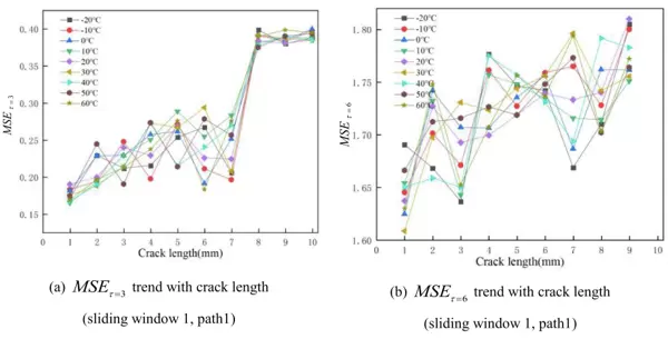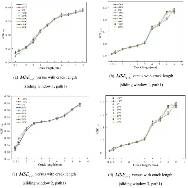 - 基于方差的MSE:随裂纹长度增加呈单调变化趋势,且在不同温度下曲线高度重合,表现出良好的温度不变性。