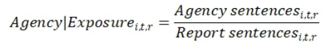 计算上市公司年报中提及政府机构以及以下任何形式的机构行动词的句子数量来衡量对政府机构的暴露程度:监管、管辖权、权力、审查、审计、执行和调查等(详见下方词典)。从政府获取了政府机构名称的综合列表,要求句子中包含一个行动词,以排除那些未表明由该机构监督的机构的引用。如果一个句子包含行动词但不包含机构名称,或者包含机构名称但不包含行动词,都不会将其视为表明接触了政府机构。基于文本的公司层面政府机构接触度测量指标,是指表明接触特定政府机构的句子数量除以上市公司年报文件中总句子数的比例。公式如下图所示: