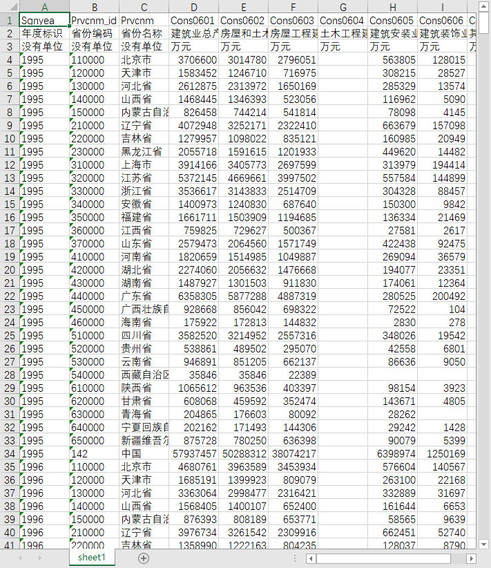 年度标识 省份编码 省份名称 建筑业总产值 房屋和土木工程建筑业总产值 房屋工程建筑业总产值 土木工程建筑业总产值 建筑安装业总产值 建筑装饰业总产值 其他建筑业总产值