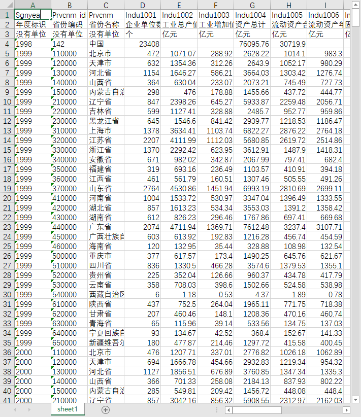 年度标识 省份编码 省份名称 企业单位数 工业总产值 工业增加值 资产总计 流动资产合计 流动资产年平均余额 固定资产原价 固定资产净值年平均余额 负债合计 流动负债合计 所有者权益合计 主营业务收入 主营业务成本 主营业务税金及附加 利润总额 本年应交增值税 全部从业人员年平均人数