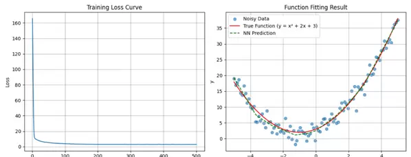 尽管所用神经网络结构简洁,但其展现出强大的非线性拟合能力。训练过程中损失快速下降,验证了参数更新策略的有效性;在预测阶段,模型能精准还原二次函数的整体形态,即使输入数据存在干扰,依然能够剥离噪声、逼近真实函数的本质规律。