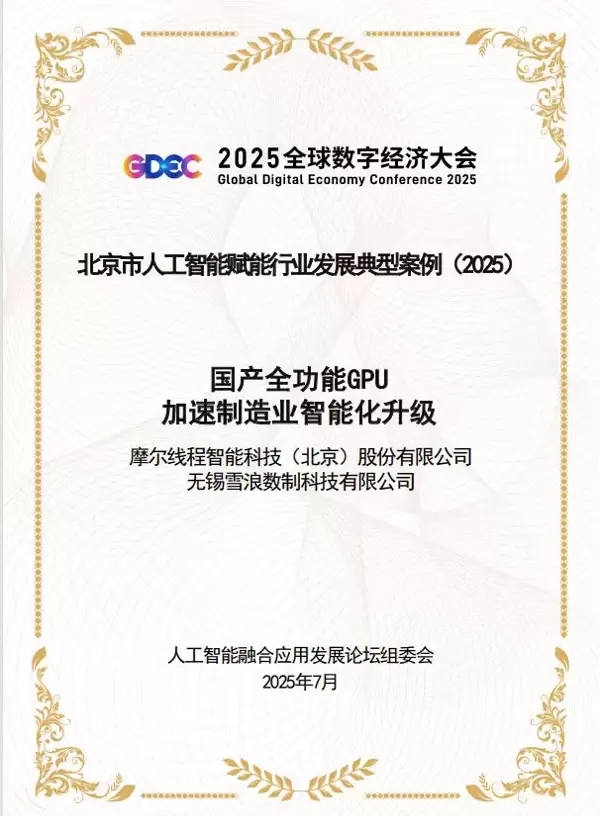 为呈现北京在“人工智能+”行业中的领先实践,打造中国数字经济发展的示范样本,本次大会面向全市征集“北京市人工智能赋能行业发展典型案例”。摩尔线程联合工业领域合作伙伴雪浪云申报的“国产全功能GPU加速制造业智能化升级”项目成功入选,成为重点展示案例之一。