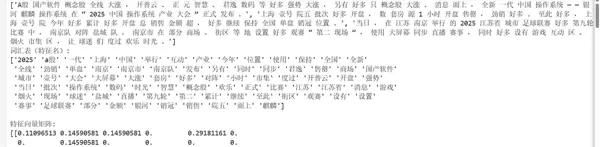 这段代码的核心目的在于:识别出第一句话中最能代表其内容的关键词语,并输出它们对应的 TF-IDF 权重分数,从而实现关键词提取的功能。
