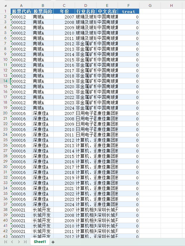 本数据集的核心变量“treat”构建方法参考周科选等(2024)的研究,定义为:若企业在某一年度被认定为制造业与互联网融合发展试点单位,则在该年度及之后年份中,treat取值为1,否则为0。该变量可用于构建DID模型中的政策交互项,进而识别政策冲击对企业全要素生产率、创新能力、融资约束等关键指标的影响。数据集系统整理了试点企业的股票代码、简称、全称、行业分类及统计截止日期等基本信息,具备结构化与标准化特征。