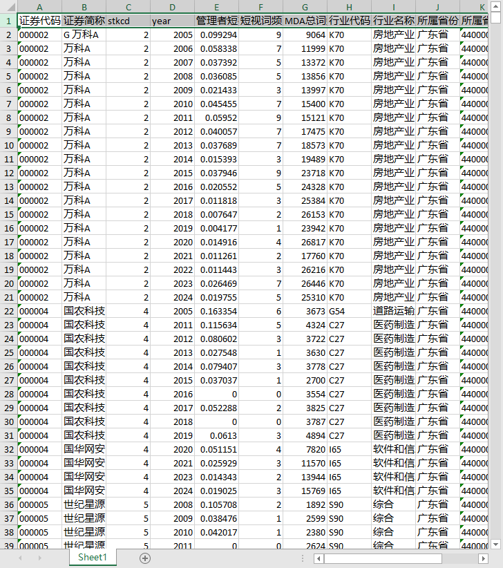 证券代码 证券简称 stkcd year 管理者短视主义 短视词频 MDA总词数 行业代码 行业名称 所属省份 所属省份代码 所属城市 所属城市代码