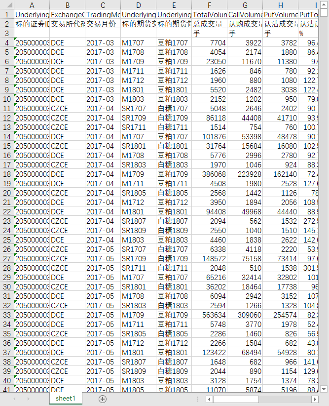 标的证券ID 交易所代码 交易月份 标的期货交易代码 标的期货简称 总成交量 认购成交量 认沽成交量 认沽认购成交比率 总持仓量 认购持仓量 认沽持仓量 认沽认购持仓比率 总成交额 日认购成交额 日认沽成交额 认沽认购成交额比率