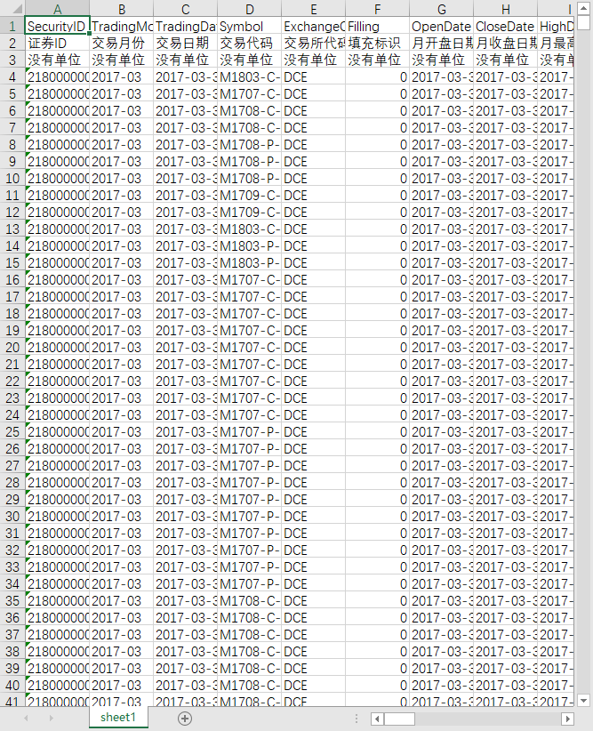 证券ID 交易月份 交易日期 交易代码 交易所代码 填充标识 月开盘日期 月收盘日期 月最高价日 月最低价日 月最高收盘价日 月最低收盘价日 月最高结算价日 月最低结算价日 月最高收盘价 月最低收盘价 月最高结算价 月最低结算价 月开盘价 月最高价 月最低价 月收盘价 月结算价 上月结算价 累计涨跌1 累计涨跌2 月持仓量 月最高持仓量 月最低持仓量 月持仓量变化 月总成交量 月最高成交量 月最低成交量 月总成交额 月最高成交金额 月最低成交金额 月累计交易天数 月成交均价 涨跌幅 涨跌幅(收盘价) 涨跌幅(结算价) 月振幅 月日均成交量 月日均成交额 月日均持仓量