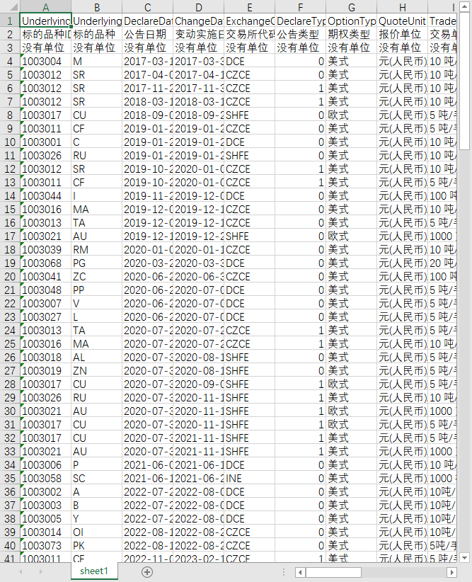 标的品种ID 标的品种 公告日期 变动实施日期 交易所代码 公告类型 期权类型 报价单位 交易单位 最小变动价位 每日价格最大波动限制 合约月份 交易时间 到期日规则 行权日规则 交易手续费 单笔市价最大委托数量 单笔限价最大委托数量 单笔最小买入量 单笔最小卖出量