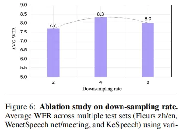 测试不同下采样率(2、4、8)对 ASR 平均 WER 的影响(参见图 6):