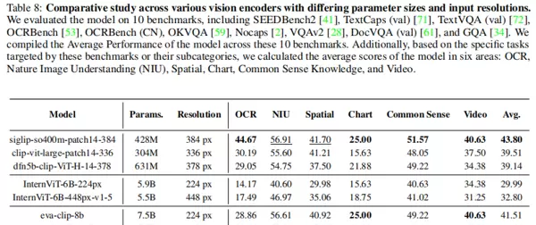 - 最优方案:Siglip-so400m-patch14-384(428M 参数)在 OCR 与自然图像理解等 6 项子任务中 4 项表现最佳,平均分达 43.80,在性能与效率之间取得良好平衡。