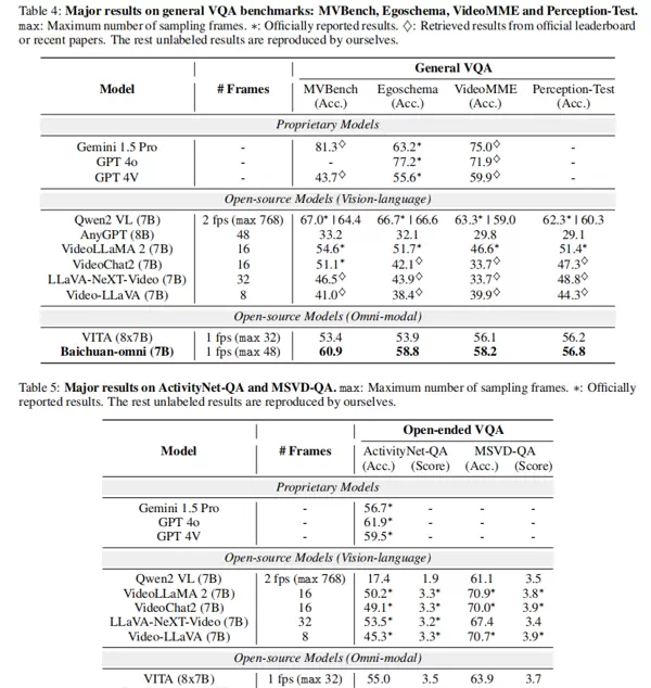 - 通用视频 QA 任务中表现卓越,相较开源模型 VITA 平均提升 4%,在 MVBench(60.9% vs 53.4%)和 Egoschema(58.8% vs 53.9%)上均实现领先,并优于闭源模型 GPT-4V;
