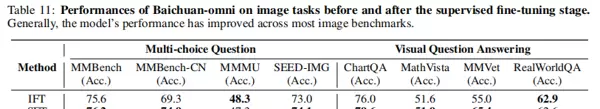 图像任务(见表 11):经过监督微调(SFT)后,模型在 MMBench-CN 上的表现从 69.3 提升至 74.9,在 MMVet 上也由 55.0 显著上升至 65.4,显示出明显的性能增强;