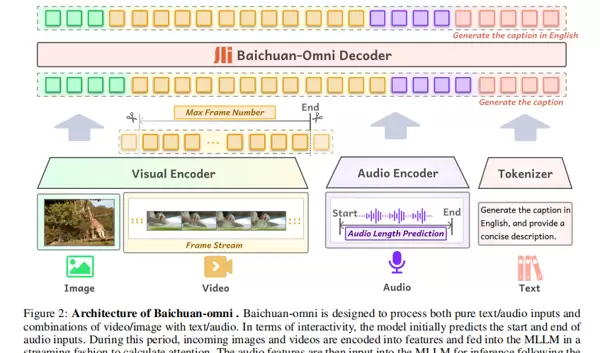 Baichuan-Omni 的架构围绕“多模态统一编码”与“流式交互机制”展开,其结构如图 2 所示: