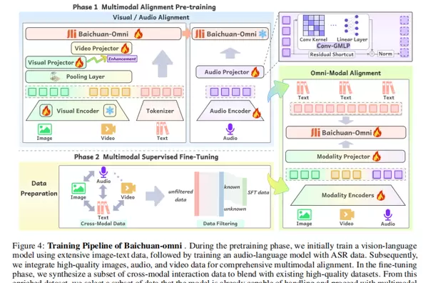Baichuan-Omni 采用“高质量数据构建 → 分阶段模态对齐 → 多任务微调”的系统化框架,在仅 7B 参数规模下实现了全模态能力的突破: