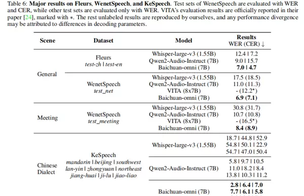 - ASR 表现突出:在中文语音识别任务中显著优于现有模型,Fleurs-zh 的 WER 低至 7.0%,优于 Qwen2-Audio-Instruct 的 9.0%;对方言的识别能力优异(KeSpeech 平均 CER 为 6.7%);在会议类复杂场景下(WenetSpeech test_meeting)CER 达到 8.9%,远超 VITA 的 16.5%;