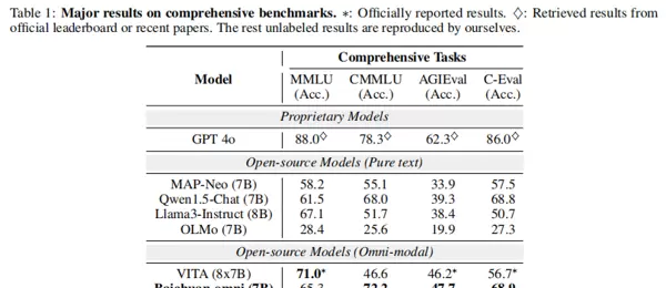 - 在 AGIEval 上也实现超越(47.7% vs 46.2%),表明全模态训练未损害语言能力,反而有所增益。