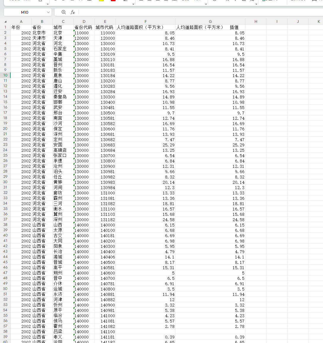 人均道路面积(平方米)(插值):对缺失值进行插值处理后的人均道路面积