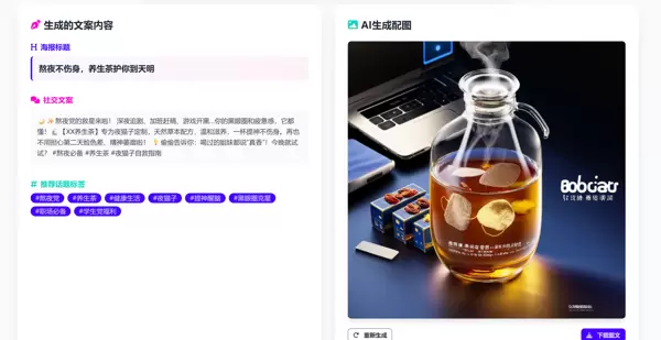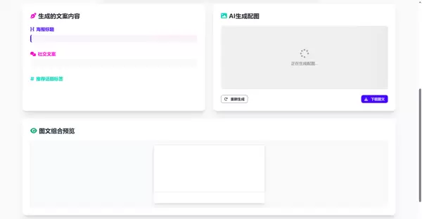 - 图文组合输出:提供实时预览功能,可查看文案与图片的组合效果,支持一键下载使用。