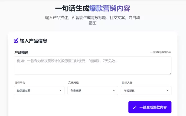 - 一句话智能生成:仅需输入产品或活动描述,即可自动生成适用于多种场景的海报标题和社交平台文案。