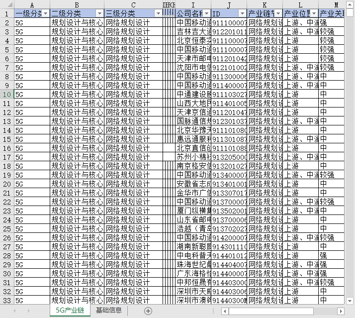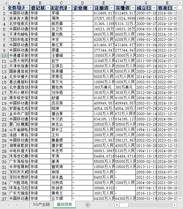移动通讯5G产业链上中下游企业信息1949-2025参保人数联系电话法定代表人所属行业省份城市区县等