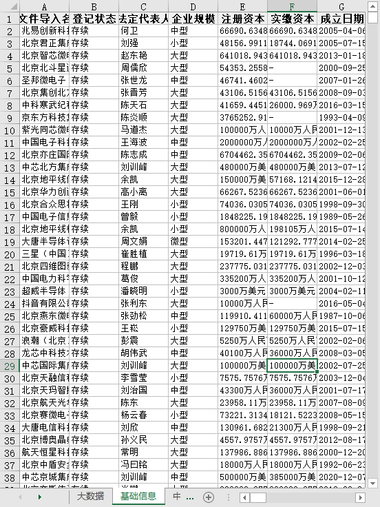 原文件导入名称 登记状态 法定代表人 企业规模 注册资本 实缴资本 成立日期 核准日期 营业期限 所属省份 所属城市 所属区县 企业(机构)类型 国标行业门类 国标行业大类 国标行业中类 国标行业小类 曾用名 英文名 统一社会信用代码 纳税人识别号 注册号 组织机构代码 参保人数 参保人数所属年报 电话 更多电话 企业地址 通信地址 官网 邮箱 更多邮箱 经营范围 登记机关 纳税人资质 企业简介 最新年报年份 等等