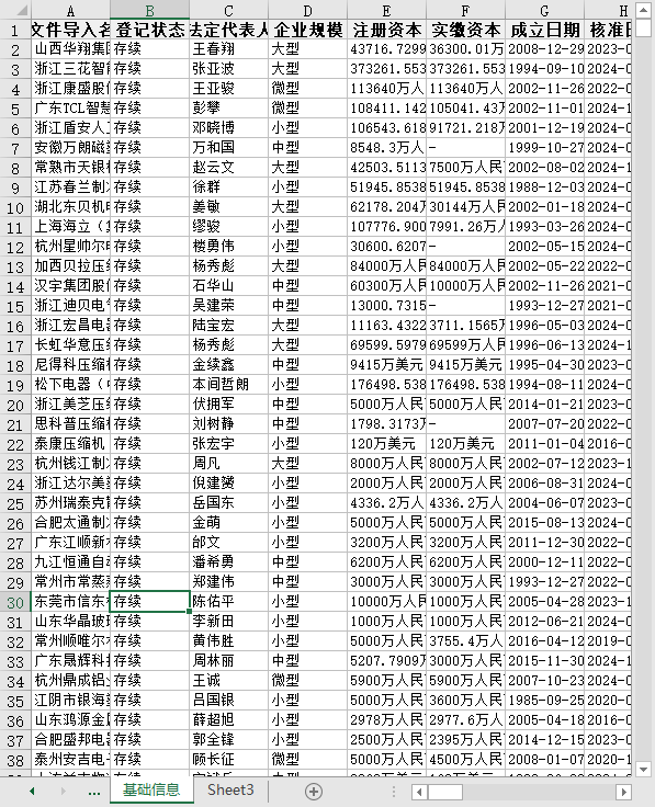 原文件导入名称 登记状态 法定代表人 企业规模 注册资本 实缴资本 成立日期 核准日期 营业期限 所属省份 所属城市 所属区县 企业(机构)类型 国标行业门类 国标行业大类 国标行业中类 国标行业小类 曾用名 英文名 统一社会信用代码 纳税人识别号 注册号 组织机构代码 参保人数 参保人数所属年报 电话 更多电话 企业地址 通信地址 官网 邮箱 更多邮箱 经营范围 登记机关 纳税人资质 企业简介 最新年报年份 等等