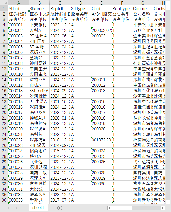证券代码 证券中文简称 统计截止日期 股票类型 A/B/H股交叉码 公告类型 公司名称 公司中文简称 行业名称C 行业代码C 行业名称B 行业代码B 行业名称A 行业代码A 经营范围 公司沿革 注册资本