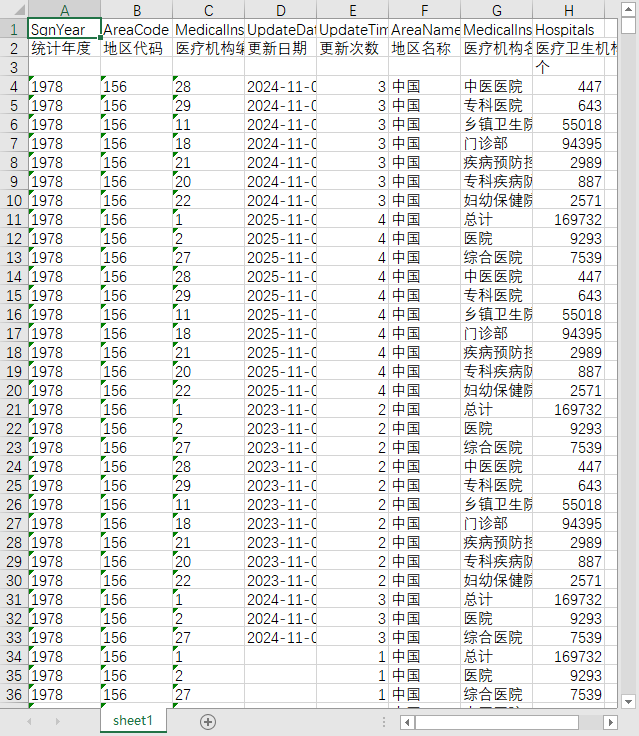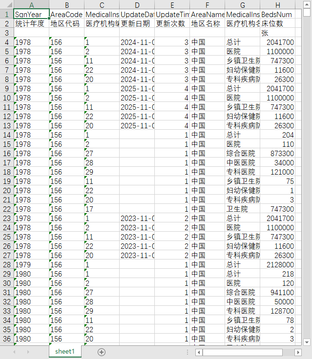 统计年度 地区代码 医疗机构编码 更新日期 更新次数 地区名称 医疗机构名称 床位数
