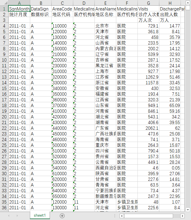 统计月度 数据标识 地区代码 医疗机构编码 地区名称 医疗机构名称 诊疗人次数 出院人数