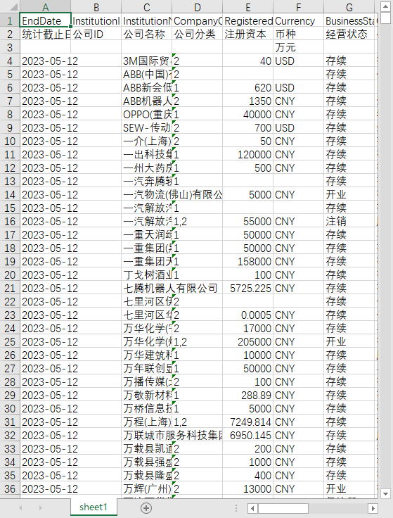 统计截止日期 公司ID 公司名称 公司分类 注册资本 币种 经营状态 公司类型 行业名称A 成立日期 核准日期 注册地址 所属省份 所属城市 经营范围