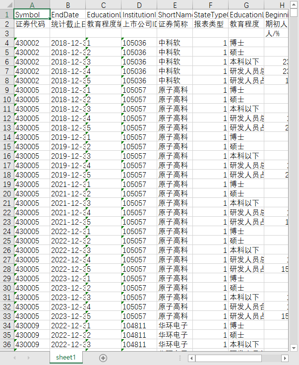证券代码 统计截止日期 教育程度编码 上市公司ID 证券简称 报表类型 教育程度 期初人数/比例 期末人数/比例