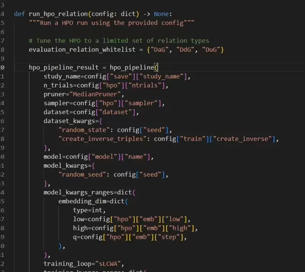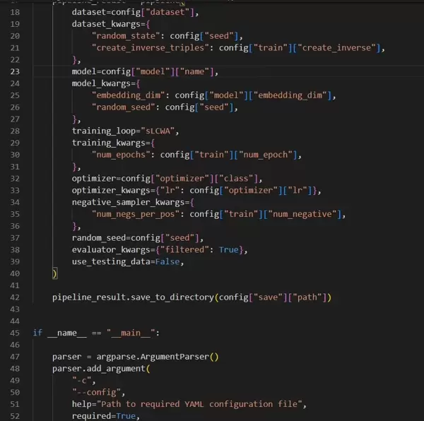 所采用的数据集为OpenBioLink,涵盖药物、基因及疾病之间的多种实体关系。其中参数create_inverse_triples起到重要作用,它会自动生成反向三元组,增强模型对关系对称性的捕捉能力。但需注意,这一操作将显著增加内存占用,在大规模数据场景下应谨慎使用。