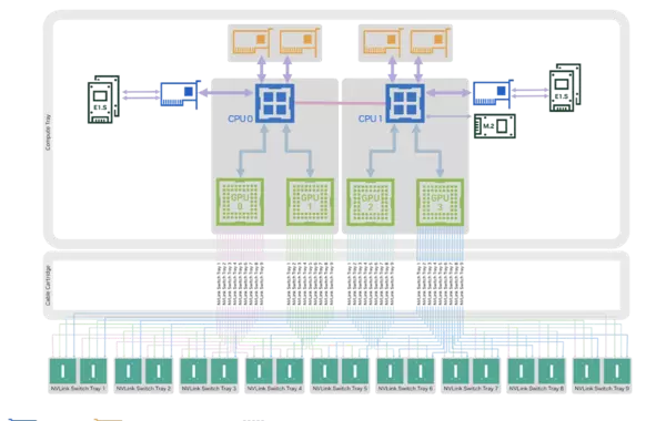 每个计算托盘还集成了四个 ConnectX-7(CX-7)网卡,支持 InfiniBand NDR(400Gbps)跨机架互联,并配备两个 BlueField-3(BF3)智能网卡,进一步增强网络处理能力。这种设计使得整个系统具备极强的数据协同和通信效率。
