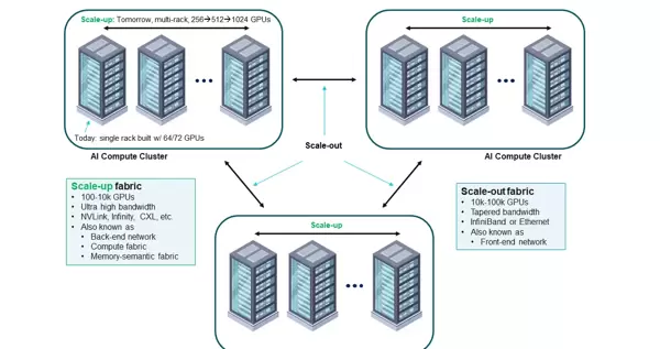 超节点的设计目标包括两个维度:纵向扩展(scale-up) 注重在单个节点或集群内部最大化通信带宽,并尽可能降低加速器之间的通信延迟;横向扩展(scale-out) 则着眼于数据中心级别,实现跨机架甚至跨集群的大规模高效互联与远距离数据传输。典型代表如 NVIDIA NVL72 和华为 CloudMatrix 384 等平台。