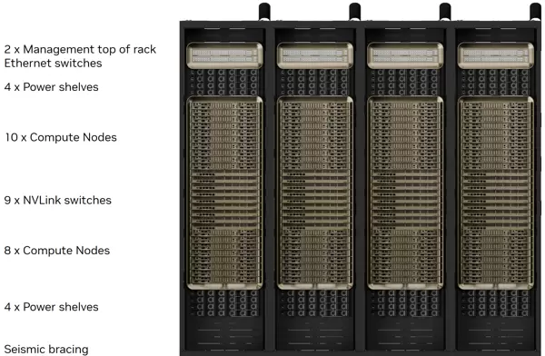 NVIDIA DGX GB200 的机架配置如下图所示,展示了一个包含四个 72-GPU 机架的前视结构:
