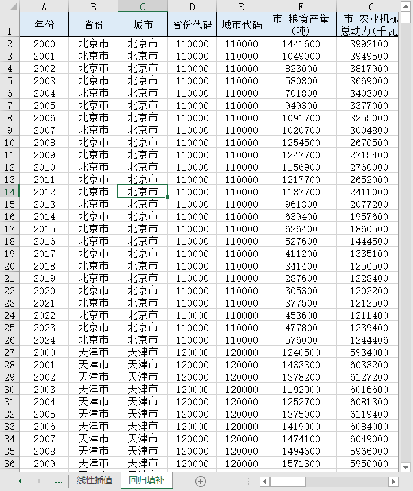 回归填补农用化肥施用量缺125(宁夏5市的)、农村全社会缺350(辽宁14市的),其余的无缺失值!!!