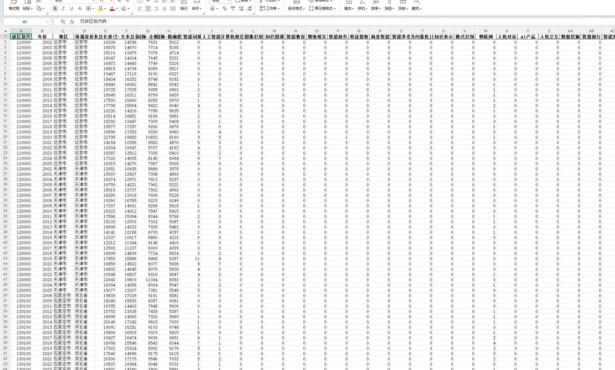 各地级市政府工作报告,整理和统计人工智能政策73个相关词频数据。数据为非平衡