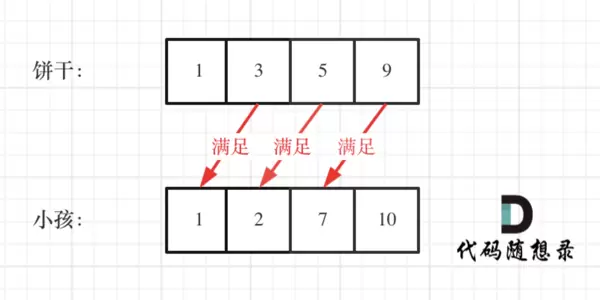 每个孩子 i 都有一个胃口值 g[i],表示能满足该孩子胃口的最小饼干尺寸;每块饼干 j 也有一个尺寸 s[j]。当且仅当 s[j] ≥ g[i] 时,才能将饼干 j 分配给孩子 i,使其得到满足。