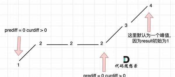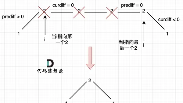我们先来分析当指向最后一个2时的情况。此时 prediff 等于0,因此必须考虑 prediff === 0 且 curdiff < 0 的情形;同理,curdiff > 0 的情况也应被涵盖。你可以试着将图像旋转180°来理解这一逻辑。由此可见,原先的判断条件并不全面,正确的判断应为:(preDiff <= 0 && curDiff > 0) || (preDiff >= 0 && curDiff < 0),这样才能完整覆盖平坡情况。