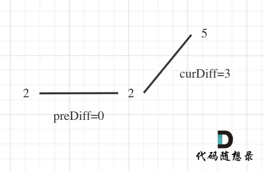 接下来看数组的首尾两端。题目中指出,若数组仅有两个不同元素,则摆动序列长度为2。然而,在计算 prediff 和 curdiff 时通常需要三个元素。那么对于仅含两个元素的数组该如何处理?