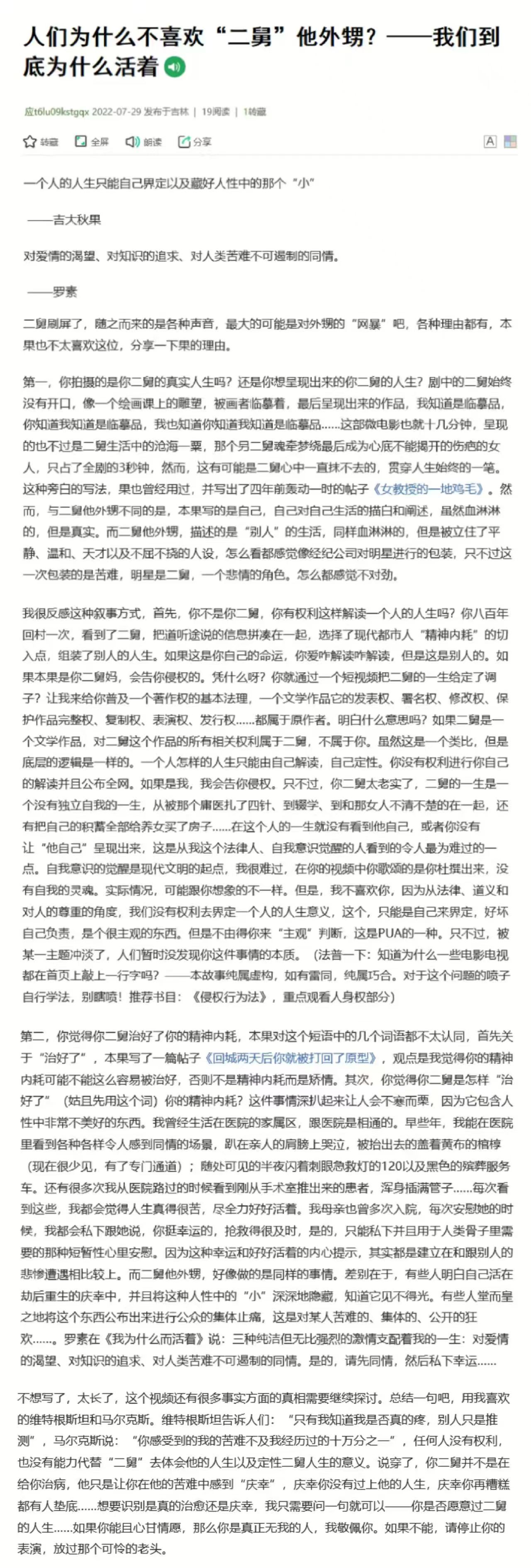 我很反感这种叙事方式,首先,你不是你二舅,你有权利这样解读一个人的人生吗?你八百年回村一次,看到了二舅,把道听途说的信息拼凑在一起,选择了现代都市人“精神内耗”的切入点,组装了别人的人生。如果这是你自己的命运,你爱咋解读咋解读,但是这是别人的。如果本果是你二舅妈,会告你侵权的。凭什么呀?你就通过一个短视频把二舅的一生给定了调子?让我来给你普及一个著作权的基本法理,一个文学作品它的发表权、署名权、修改权、保护作品完整权、复制权、表演权、发行权……都属于原作者。明白什么意思吗?如果二舅是一个文学作品,对二舅这个作品的所有相关权利属于二舅,不属于你。虽然这是一个类比,但是底层的逻辑是一样的。一个人怎样的人生只能由自己解读,自己定性。你没有权利进行你自己的解读并且公布全网。如果是我,我会告你侵权。只不过,你二舅太老实了,二舅的一生是一个没有独立自我的一生,从被那个庸医扎了四针、到辍学、到和那女人不清不楚的在一起,还有把自己的积蓄全部给养女买了房子……在这个人的一生就没有看到他自己,或者你没有让“他自己”呈现出来,这是从我这个法律人、自我意识觉醒的人看到的令人最为难过的一点。自我意识的觉醒是现代文明的起点,我很难过,在你的视频中你歌颂的是你杜撰出来,没有自我的灵魂。实际情况,可能跟你想象的不一样。但是,我不喜欢你,因为从法律、道义和对人的尊重的角度,我们没有权利去界定一个人的人生意义,这个,只能是自己来界定,好坏自己负责,是个很主观的东西。但是不由得你来“主观”判断,这是PUA的一种。只不过,被某一主题冲淡了,人们暂时没发现你这件事情的本质。(法普一下:知道为什么一些电影电视都在首页上敲上一行字吗?——本故事纯属虚构,如有雷同,纯属巧合。对于这个问题的喷子自行学法,别瞎喷!推荐书目:《侵权行为法》,重点观看人身权部分)