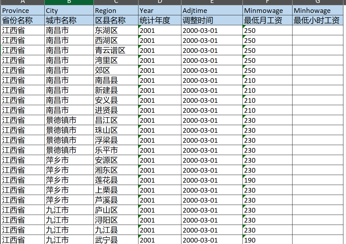 数据指标:省市县名称、统计年度、最低月工资(该项较为完整,但仍有少数缺失值,介意勿拍,缺失的情况如图)、最低小时工资(该项有缺失,缺失情况如图)。详见商品图,仅预览。