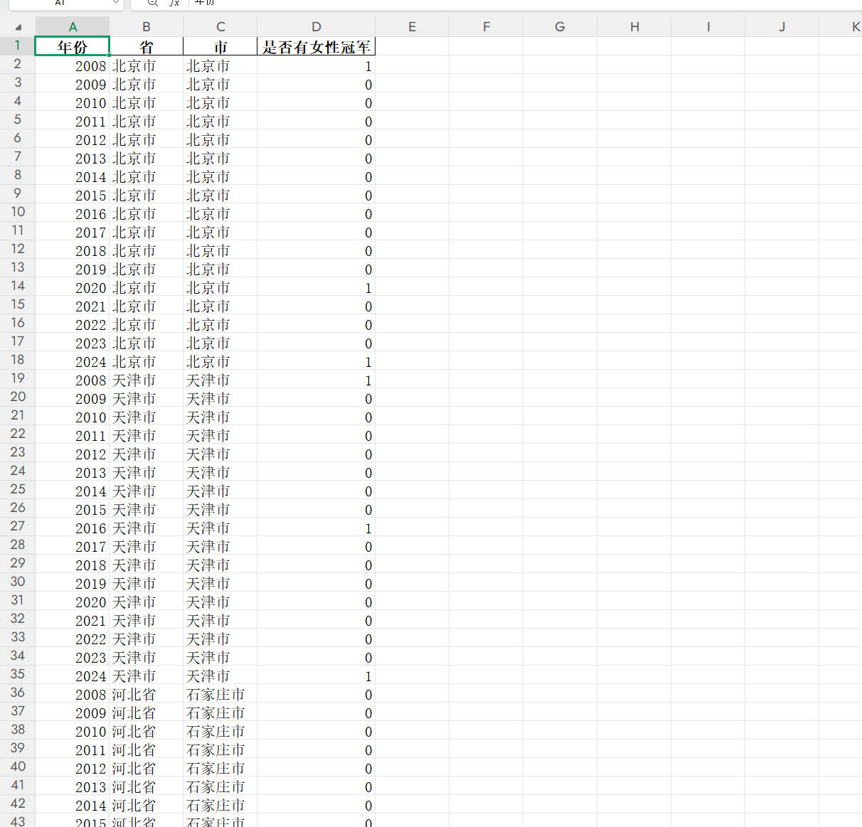 核心变量含义:在年份 t 中,地级市 c 是否产生了女性奥运冠军。